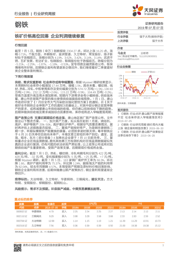 【天风证券】【20190707】20190707-天风证券-钢铁行业研究周报:铁矿价格高位回落 企业利润继续修复-12页
