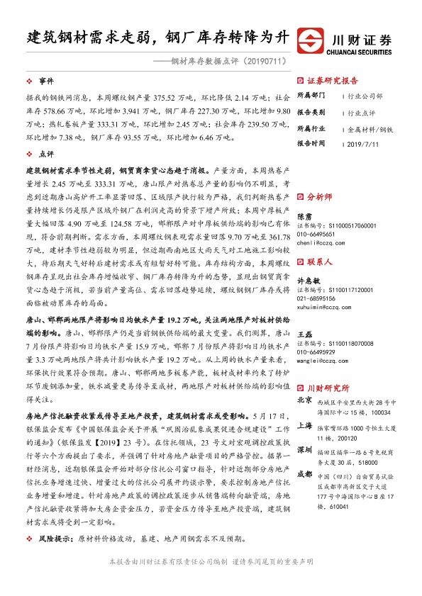 【川财证券】【20190711】钢材库存数据点评:建筑钢材需求走弱,钢厂库存转降为升-2页