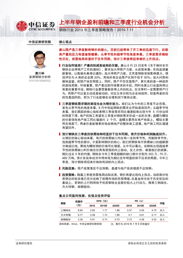 【中信证券】【20190711】钢铁行业2019年三季度策略报告:上半年钢企盈利前瞻和三季度行业机会分析-17页