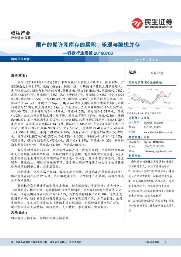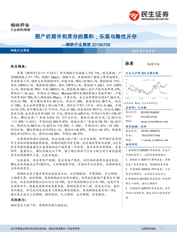 【民生证券】【20190708】20190708-民生证券-钢铁行业周报:限产的期许和库存的累积,乐观与隐忧并存-28页