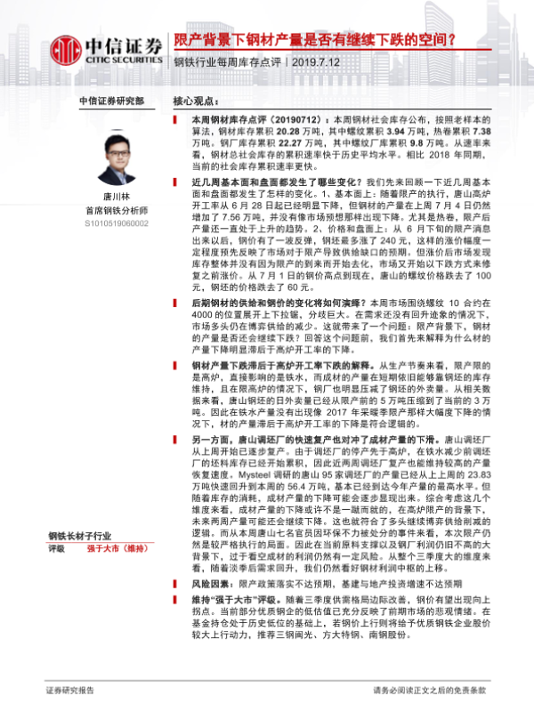 【中信证券】【20190712】20190712-中信证券-钢铁行业每周库存点评:限产背景下钢材产量是否有继续下跌的空间?-3页