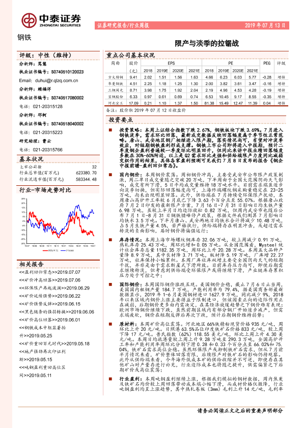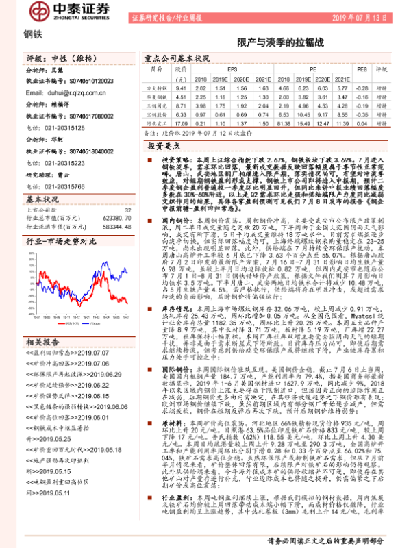 【中泰证券】【20190713】中泰证券-钢铁行业周报:限产与淡季的拉锯战-15页