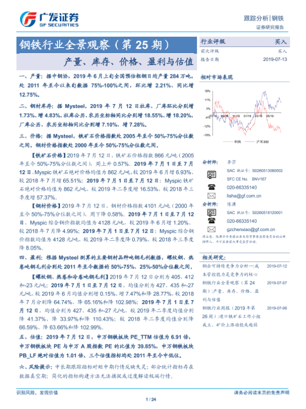 【广发证券】【20190713】20190713-广发证券-钢铁行业全景观察(第25期):产量、库存、价格、盈利与估值-24页