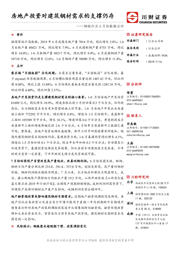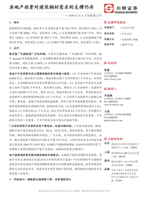 【川财证券】【20190716】钢铁行业6月份数据点评:房地产投资对建筑钢材需求的支撑仍存-2页