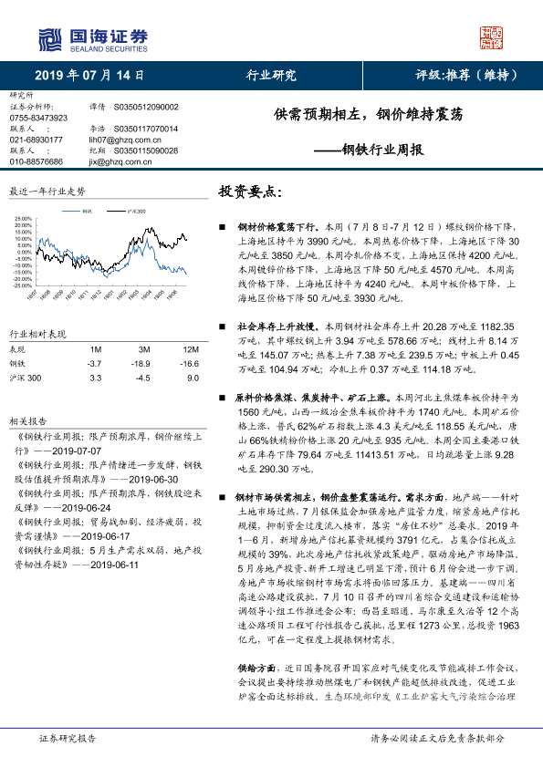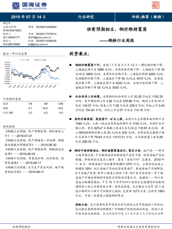【国海证券】【20190714】20190714-国海证券-钢铁行业周报:供需预期相左,钢价维持震荡-16页