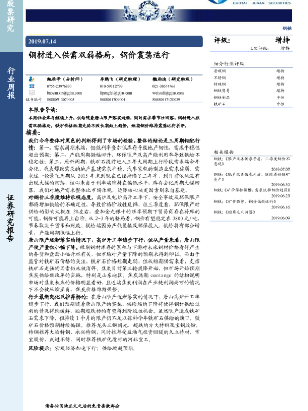 【国泰君安证券】【20190714】20190714-国泰君安-钢铁行业周报:钢材进入供需双弱格局,钢价震荡运行-23页