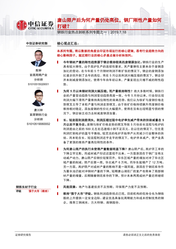 【中信证券】【20190718】20190718-中信证券-钢铁行业热点剖析系列专题之一:唐山限产后为何产量仍处高位,钢厂刚性产量如何打破?-7页