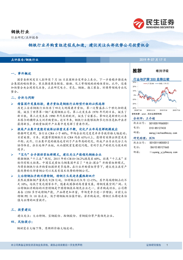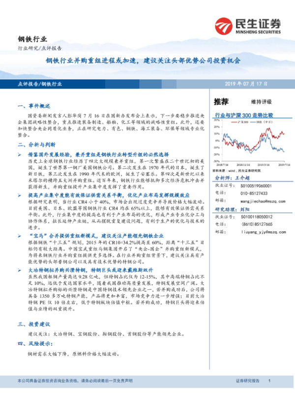 【民生证券】【20190717】钢铁行业:钢铁行业并购重组进程或加速,建议关注头部优势公司投资机会-4页