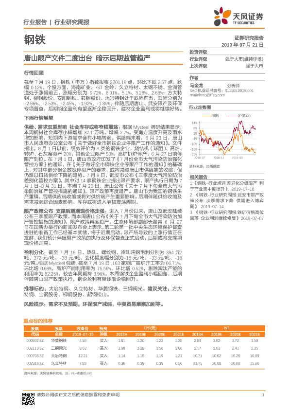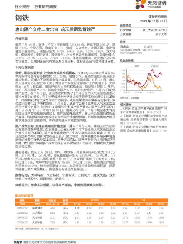 【天风证券】【20190721】20190721-天风证券-钢铁行业研究周报:唐山限产文件二度出台 暗示后期监管趋严-13页
