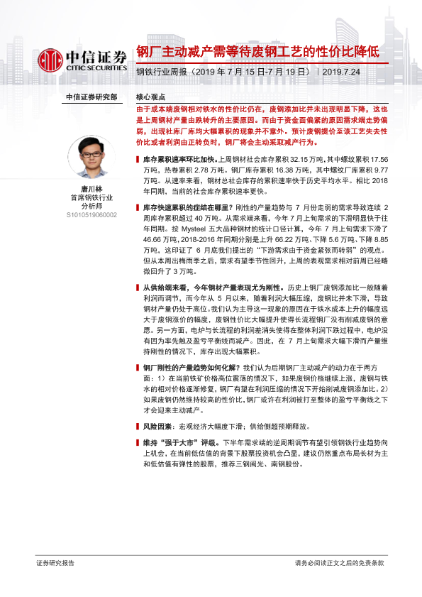 【中信证券】【20190724】钢铁行业周报:钢厂主动减产需等待废钢工艺的性价比降低-14页