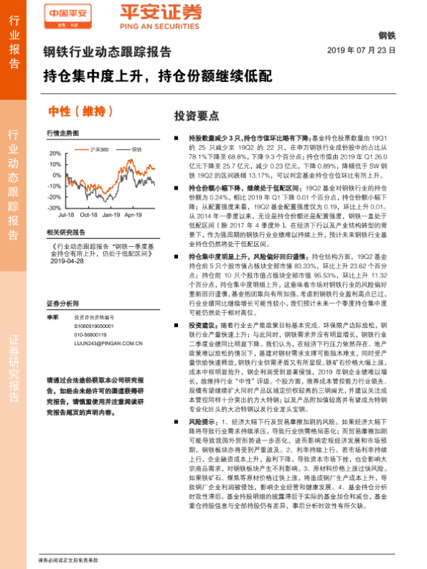 【平安证券】【20190723】钢铁行业动态跟踪报告:持仓集中度上升,持仓份额继续低配-8页