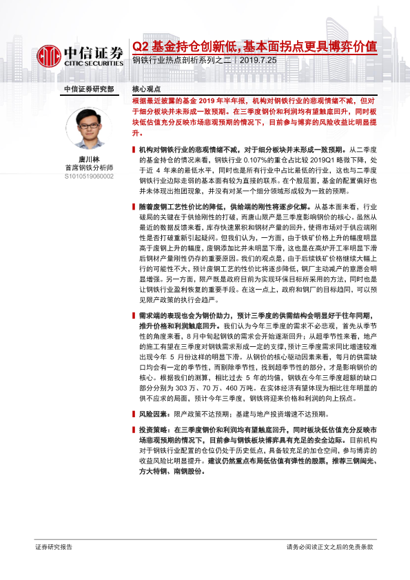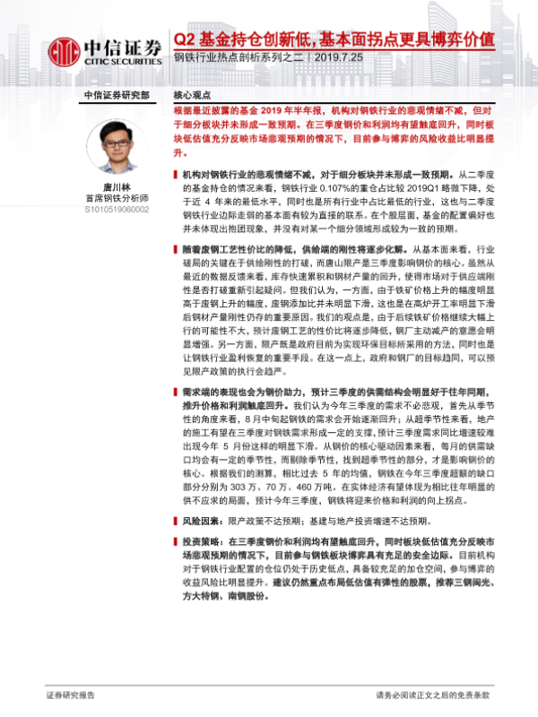 【中信证券】【20190725】20190725-中信证券-钢铁行业热点剖析系列之二:Q2基金持仓创新低,基本面拐点更具博弈价值-8页