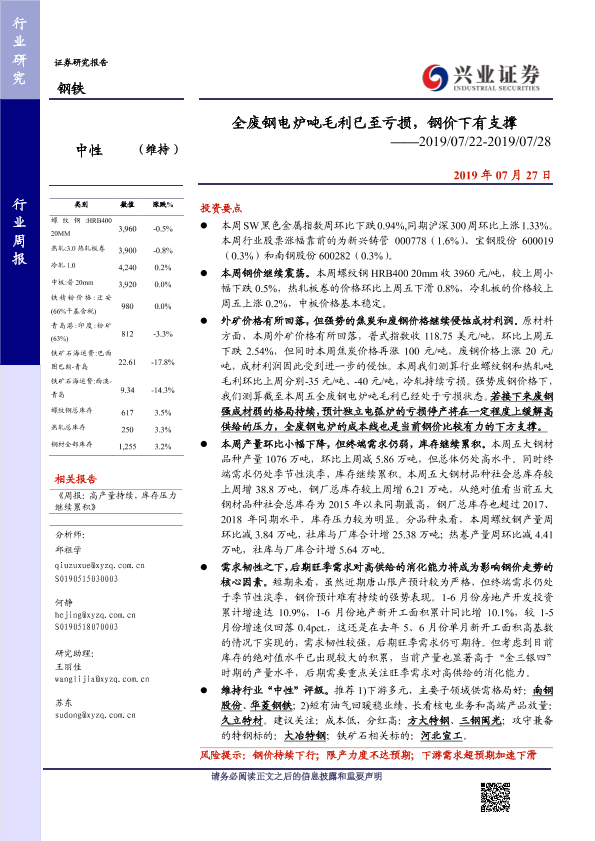 【兴业证券】【20190727】全废钢电炉吨毛利已至亏损,钢价下有支撑-17页