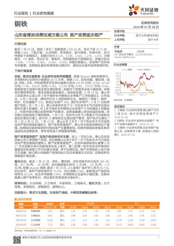 【天风证券】【20190728】20190728-天风证券-钢铁行业研究周报:山东省煤炭消费压减方案公布 限产政策逐步趋严-13页