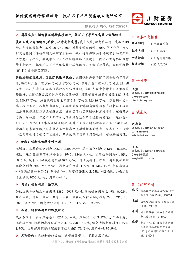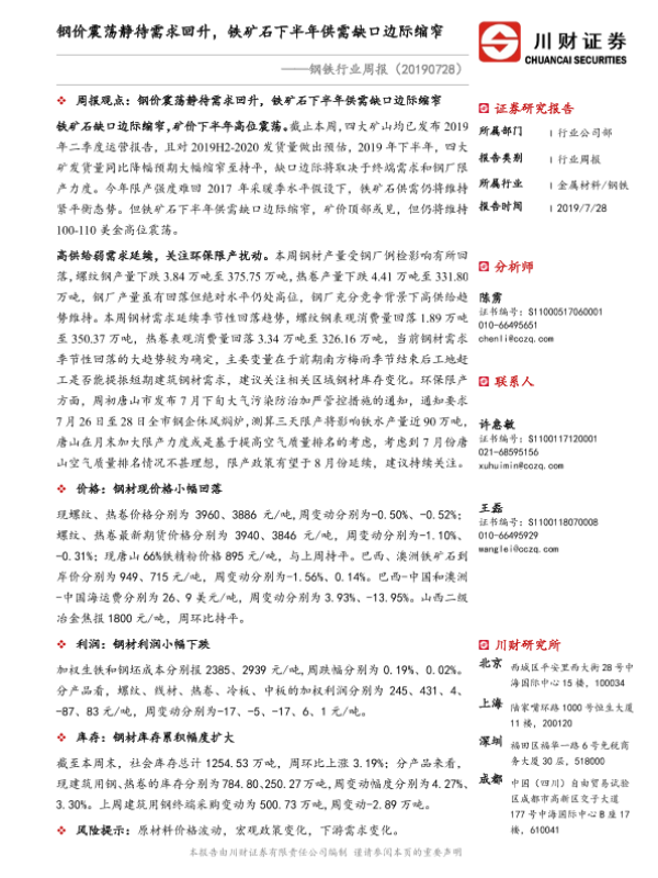 【川财证券】【20190728】20190728-川财证券-钢铁行业周报:钢价震荡静待需求回升,铁矿石下半年供需缺口边际缩窄-23页