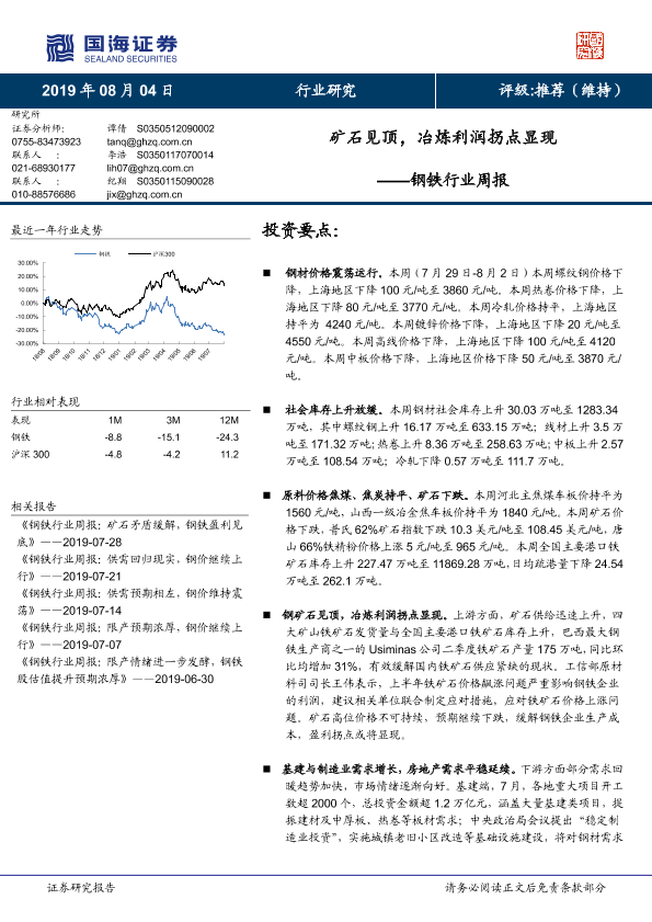 【国海证券】【20190804】20190804-国海证券-钢铁行业周报:矿石见顶,冶炼利润拐点显现-15页