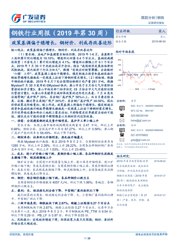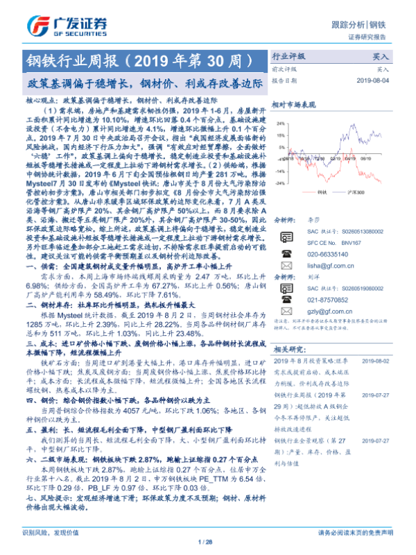 【广发证券】【20190804】20190804-广发证券-钢铁行业周报(2019年第30周):政策基调偏于稳增长,钢材价、利或存改善边际-28页