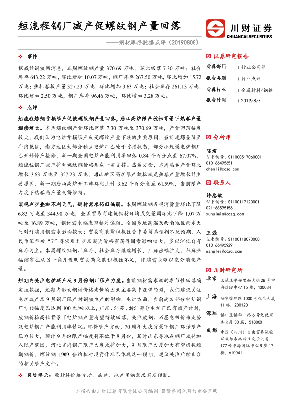 【川财证券】【20190808】钢材库存数据点评:短流程钢厂减产促螺纹钢产量回落-2页