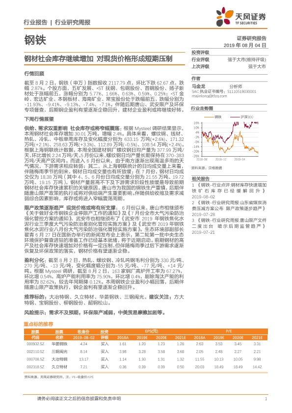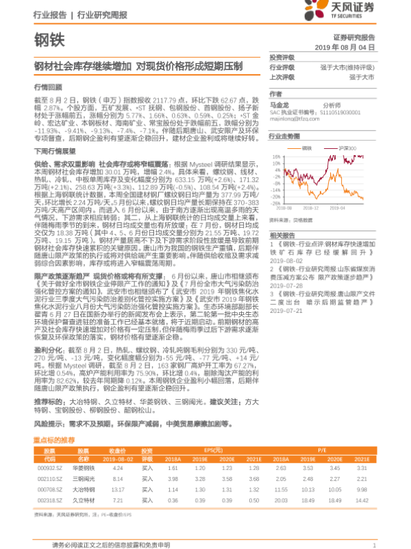 【天风证券】【20190804】20190804-天风证券-钢铁行业研究周报:钢材社会库存继续增加 对现货价格形成短期压制-12页