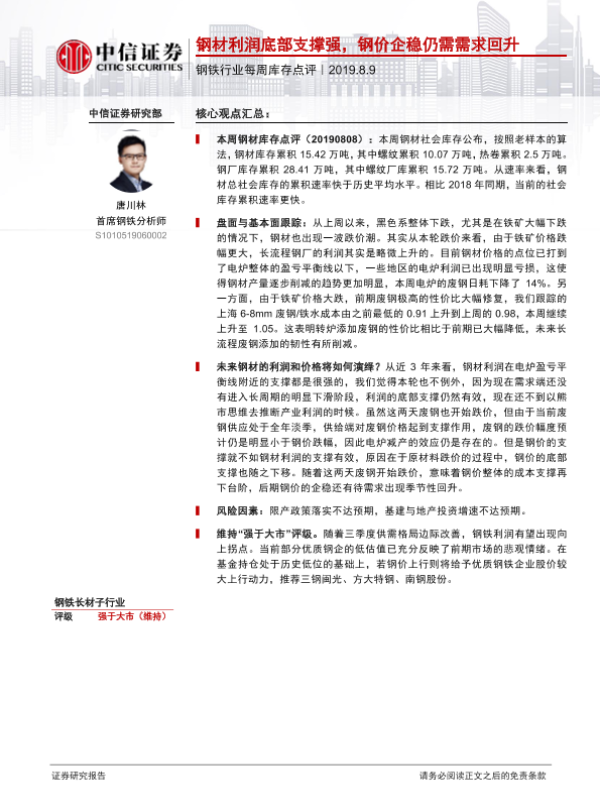 【中信证券】【20190809】钢铁行业每周库存点评:钢材利润底部支撑强,钢价企稳仍需需求回升-3页