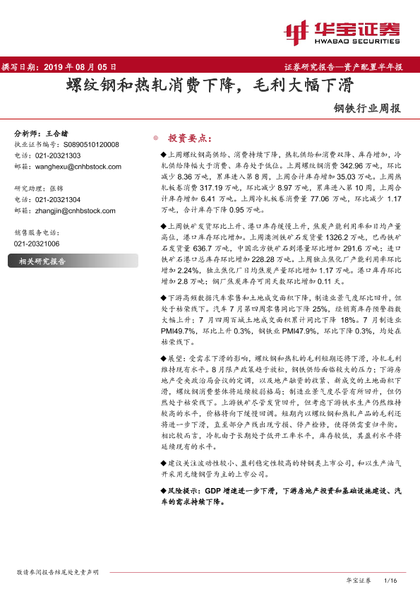 【华宝证券】【20190805】20190805-华宝证券-钢铁行业周报:螺纹钢和热轧消费下降,毛利大幅下滑-16页