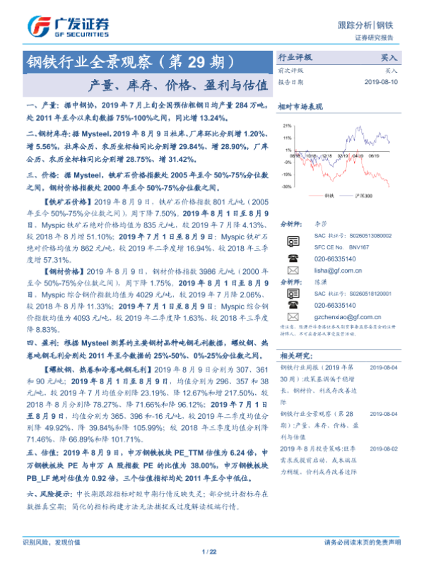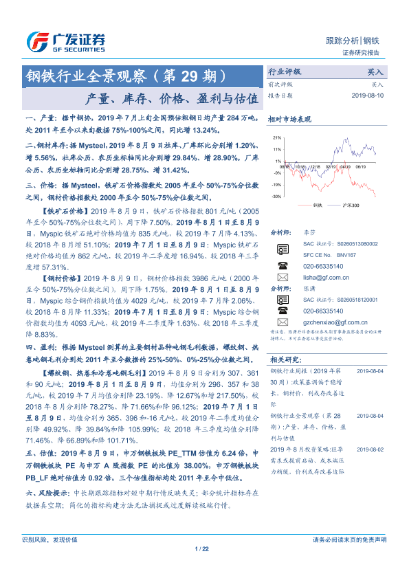 【广发证券】【20190810】20190810-广发证券-钢铁行业全景观察(第29期):产量、库存、价格、盈利与估值-22页