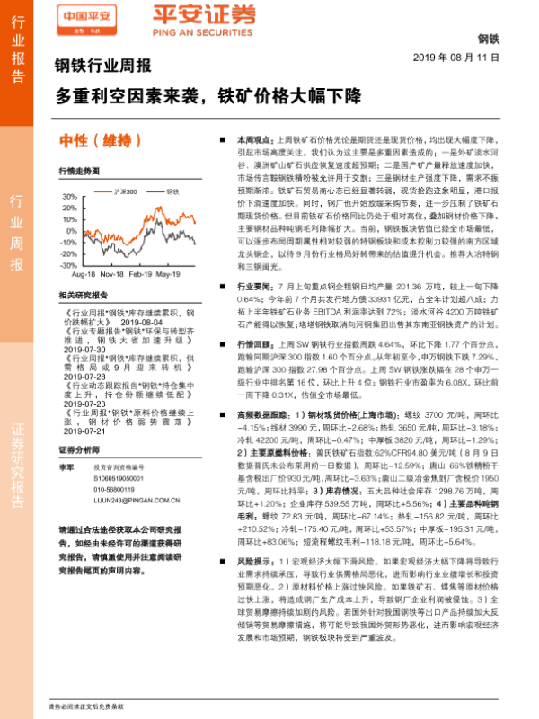 【平安证券】【20190811】20190811-平安证券-钢铁行业周报:多重利空因素来袭,铁矿价格大幅下降-6页
