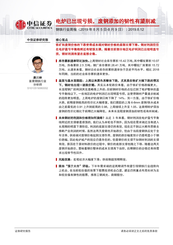 【中信证券】【20190812】钢铁行业周报:电炉已出现亏损,废钢添加的韧性有望削减-13页