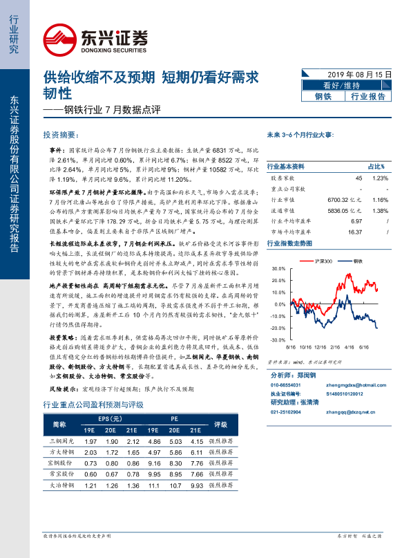 【东兴证券】【20190815】钢铁行业7月数据点评:供给收缩不及预期 短期仍看好需求韧性-8页