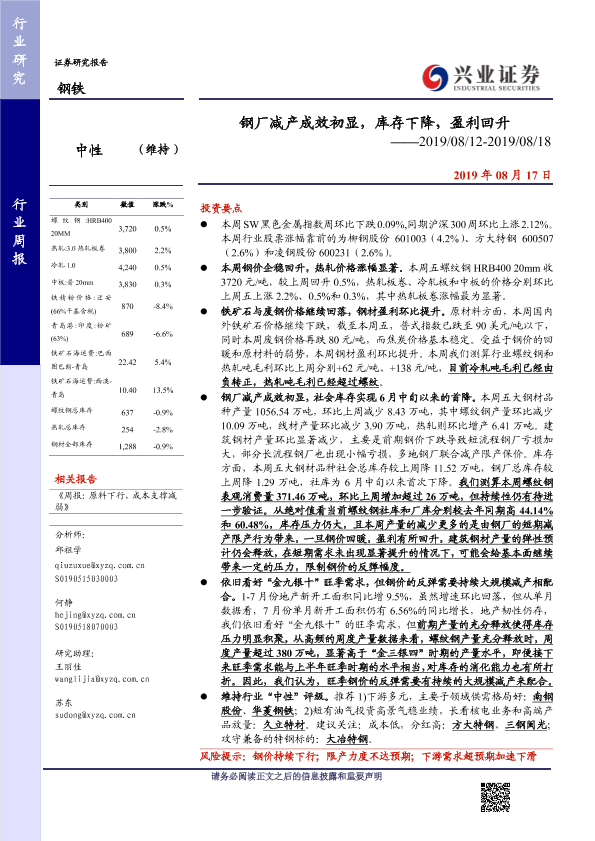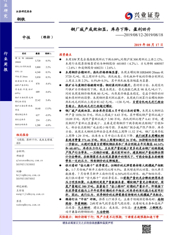 【兴业证券】【20190817】钢厂减产成效初显,库存下降,盈利回升-17页