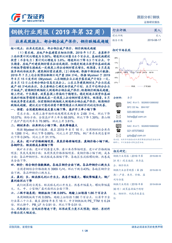 【广发证券】【20190817】20190817-广发证券-钢铁行业周报(2019年第32周):社库或现拐点、部分钢企减产保价,钢价跌幅或趋缓-28页