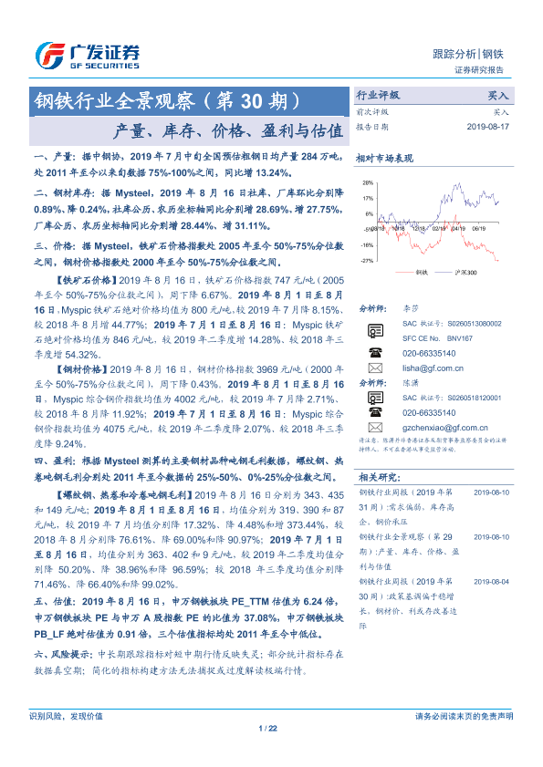 【广发证券】【20190817】20190817-广发证券-钢铁行业全景观察(第30期):产量、库存、价格、盈利与估值-22页