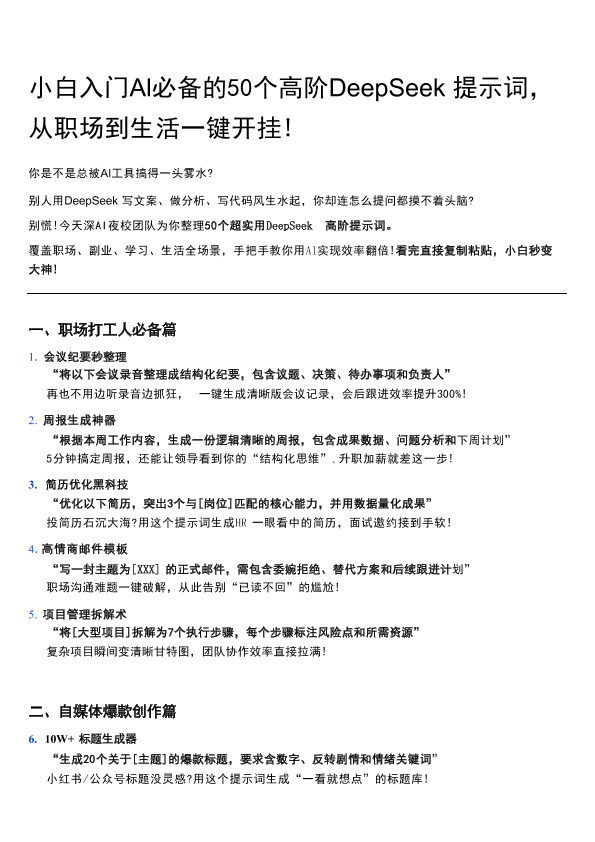 【深AI夜校团队】【20250213】小白入门DeepSeek50个高阶提示词-6页