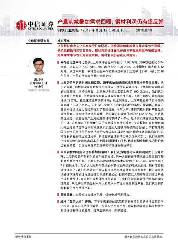 【中信证券】【20190819】钢铁行业周报:产量削减叠加需求回暖,钢材利润仍有望反弹-13页