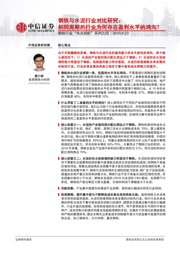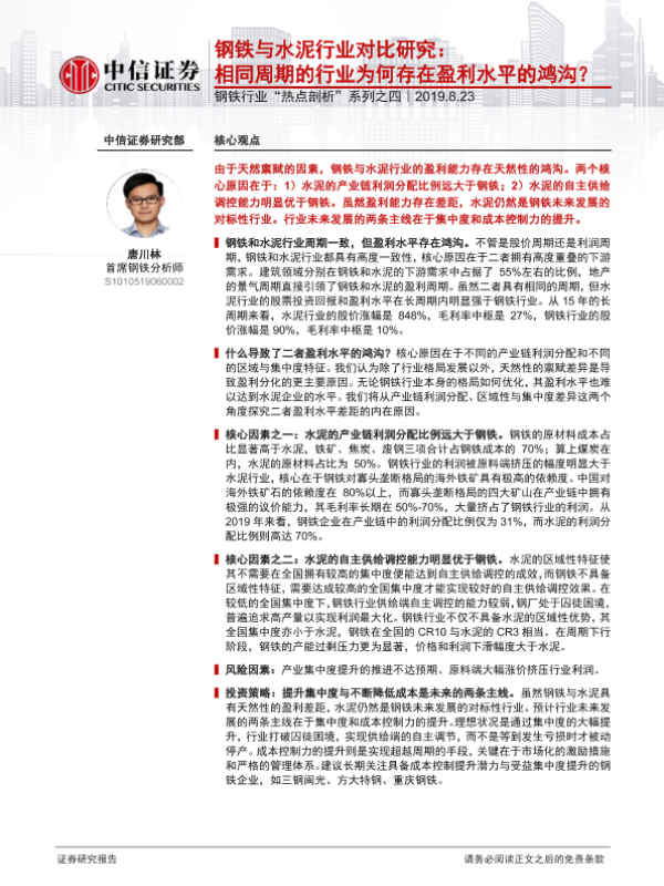 【中信证券】【20190823】钢铁与水泥行业对比研究 相同周期的行业为何存在盈利水平的鸿沟?-15页