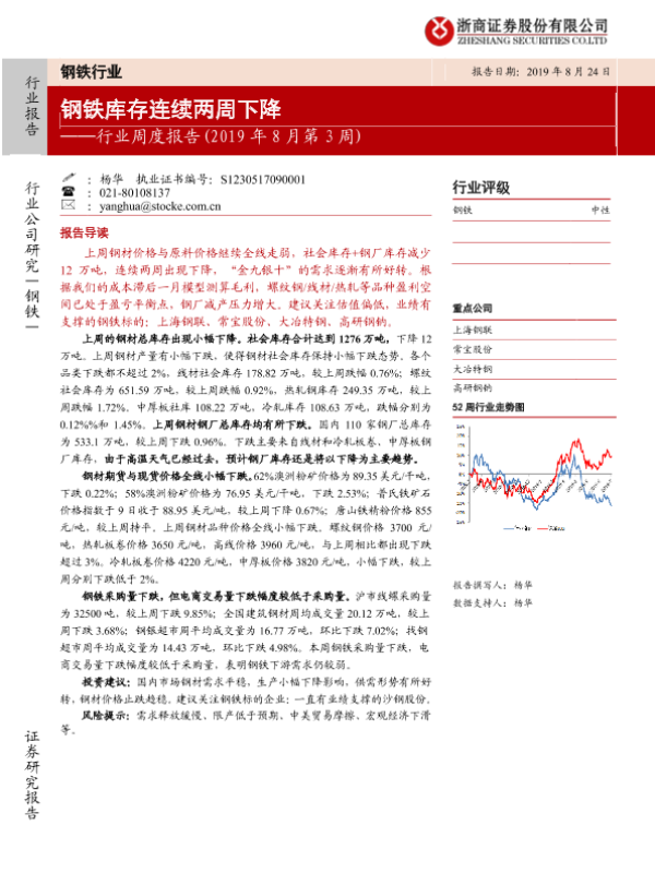 【浙商证券】【20190824】20190824-浙商证券-钢铁行业周度报告(2019年8月第2周):钢铁库存连续两周下降-16页