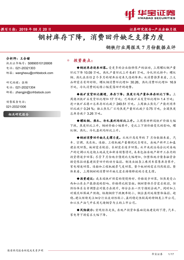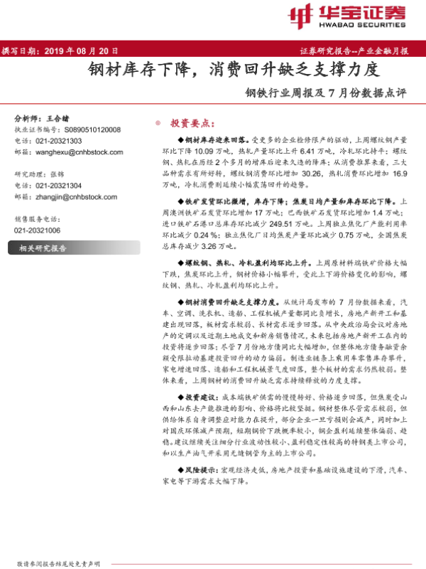 【华宝证券】【20190820】20190820-华宝证券-钢铁行业周报及7月份数据点评:钢材库存下降,消费回升缺乏支撑力度-17页
