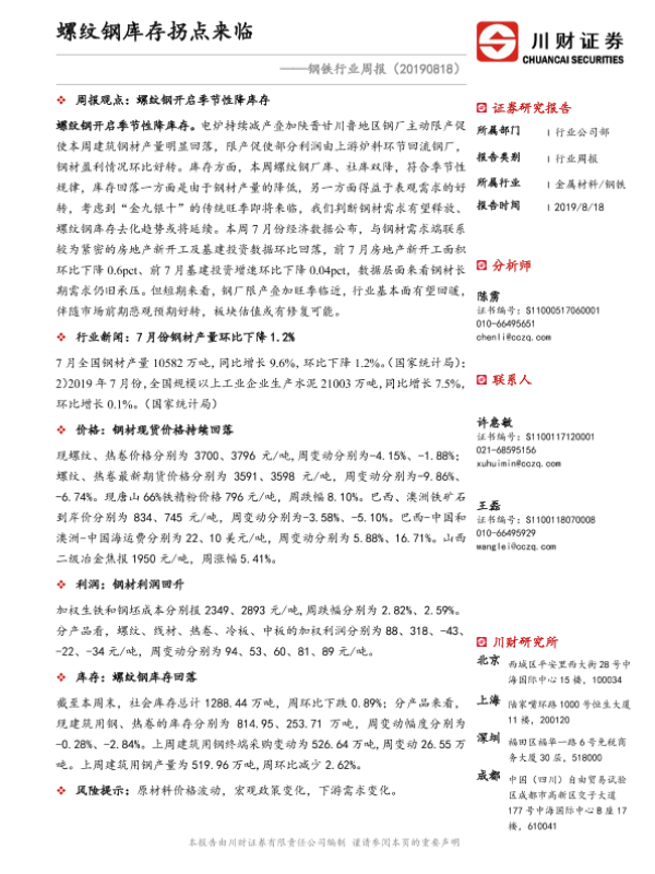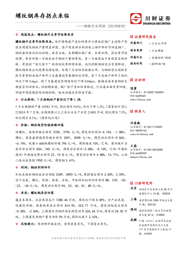 【川财证券】【20190818】20190818-川财证券-钢铁行业周报:螺纹钢库存拐点来临-22页