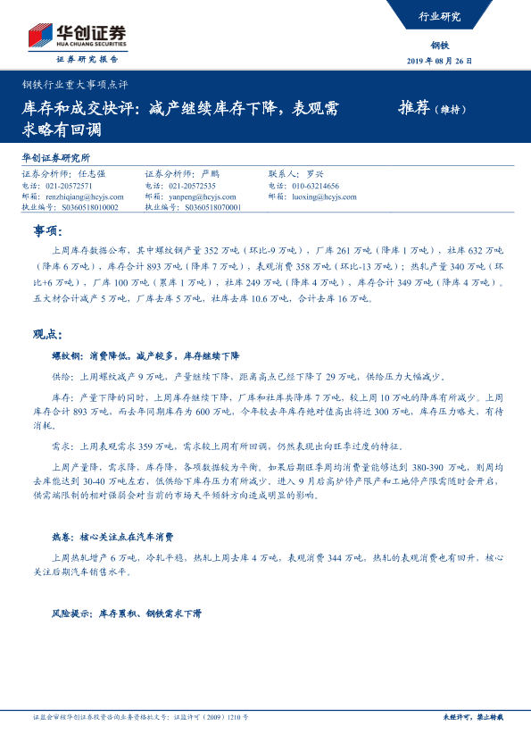 【华创证券】【20190826】钢铁行业重大事项点评:库存和成交快评:减产继续库存下降,表观需求略有回调-4页