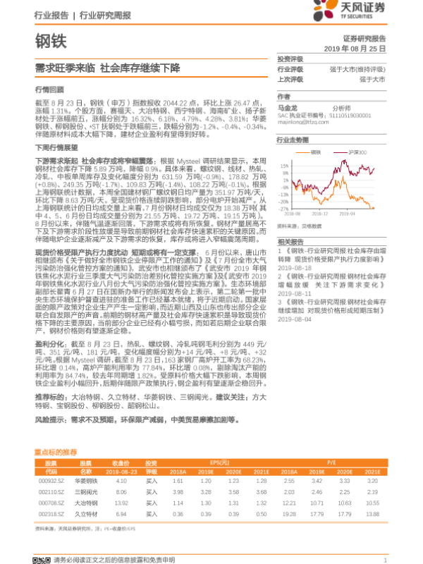 【天风证券】【20190825】20190825-天风证券-钢铁行业研究周报:需求旺季来临 社会库存继续下降-13页