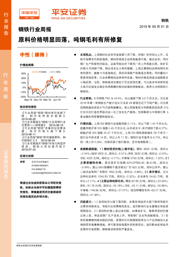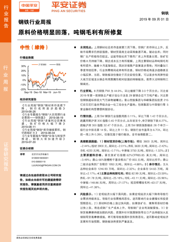 【平安证券】【20190901】20190901-平安证券-钢铁行业周报:原料价格明显回落,吨钢毛利有所修复-5页
