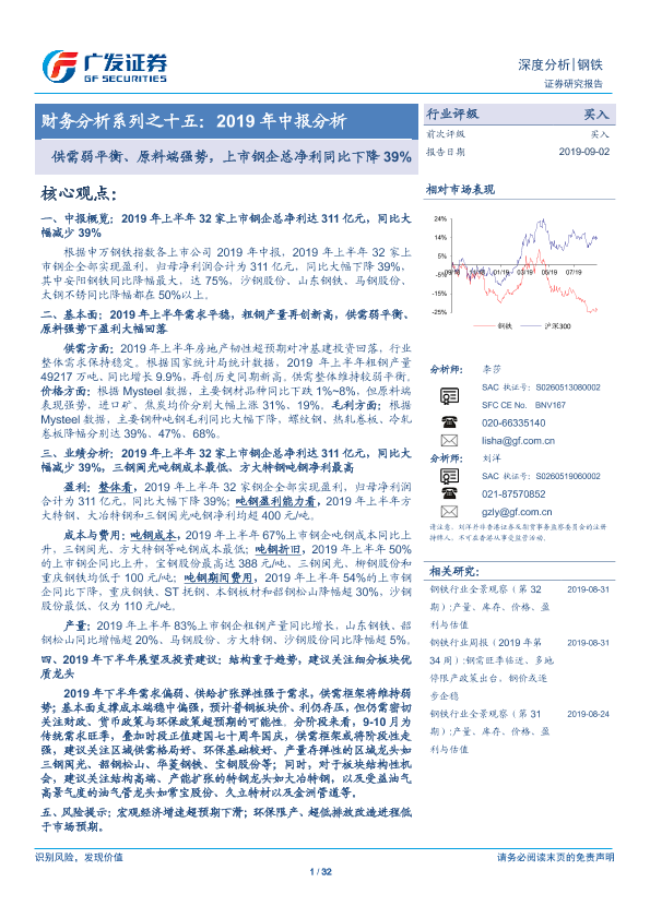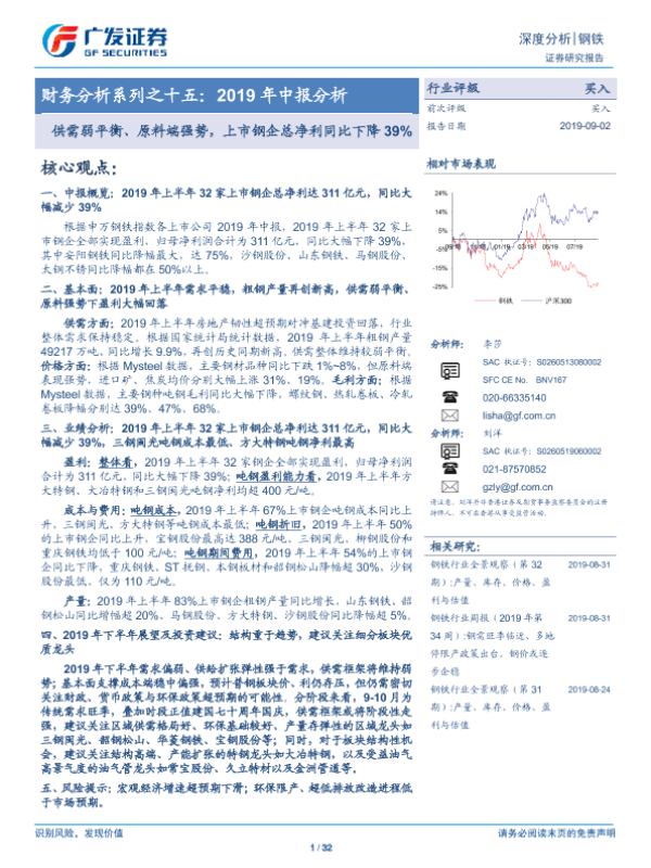 【广发证券】【20190902】20190902-广发证券-钢铁深度分析:财务分析系列之十五:2019年中报分析:供需弱平衡、原料端强势,上市钢企总净利同比下降39%-32页
