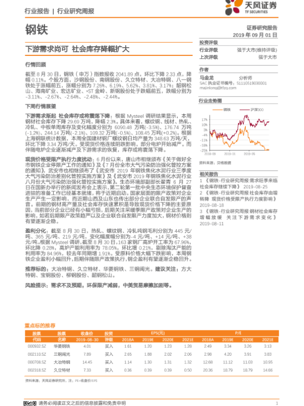 【天风证券】【20190901】20190901-天风证券-钢铁行业研究周报:下游需求尚可 社会库存降幅扩大-12页