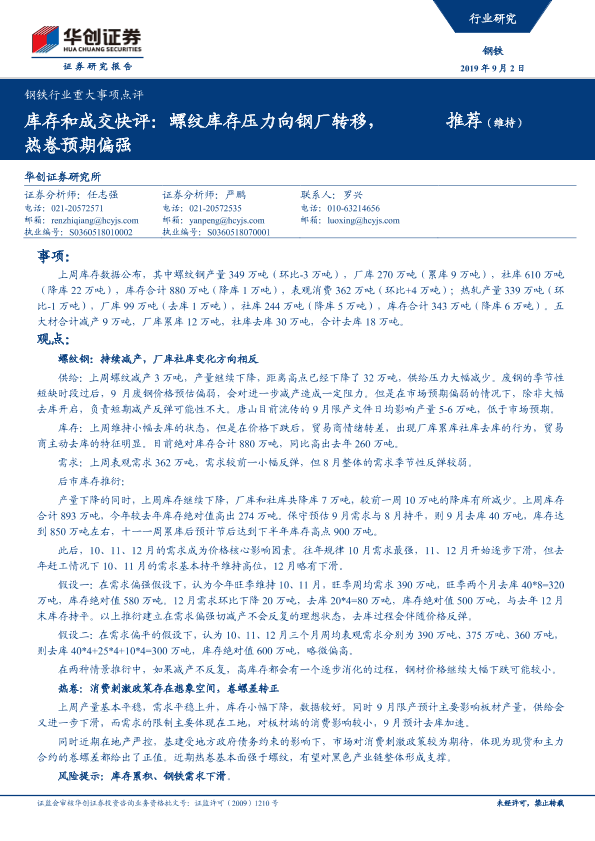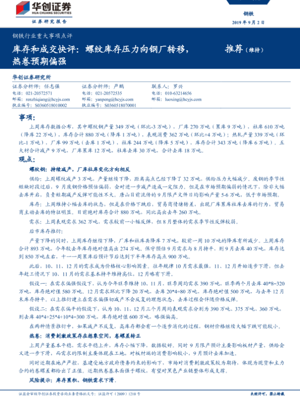 【华创证券】【20190902】钢铁行业重大事项点评:库存和成交快评:螺纹库存压力向钢厂转移,热卷预期偏强-4页