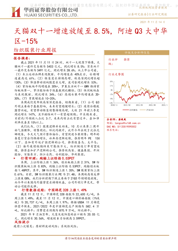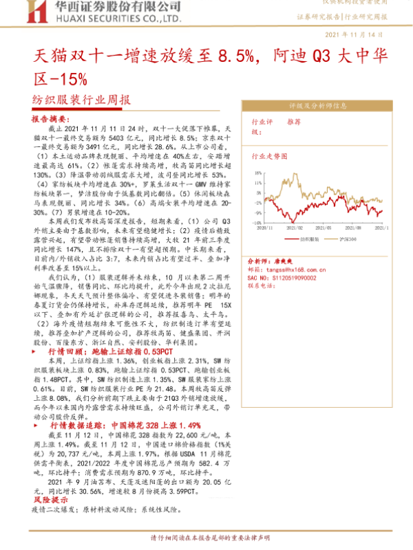 【华西证券】【20211114】纺织服装行业周报:天猫双十一增速放缓至8.5%,阿迪Q3大中华区-15%-26页