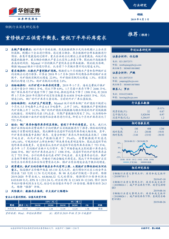 【华创证券】【20190903】20190903-华创证券-钢铁行业深度研究报告:重修铁矿石供需平衡表,重视下半年补库需求-13页