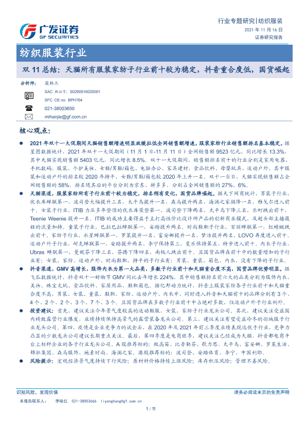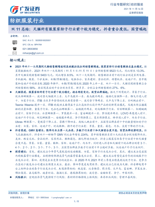 【广发证券】【20211116】20211116-广发证券-纺织服装行业双11总结:天猫所有服装家纺子行业前十较为稳定,抖音重合度低,国货崛起-11页