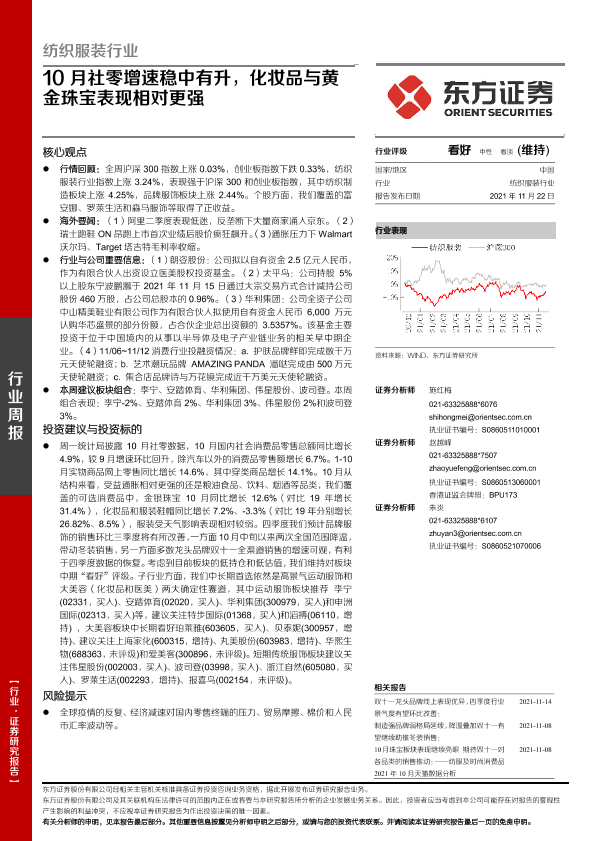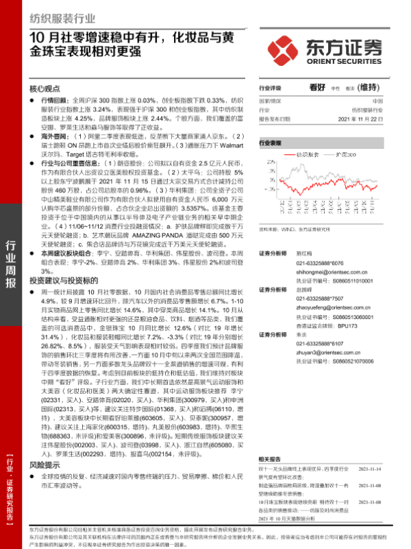 【东方证券】【20211122】20211122-东方证券-纺织服装行业周报:10月社零增速稳中有升,化妆品与黄金珠宝表现相对更强-12页