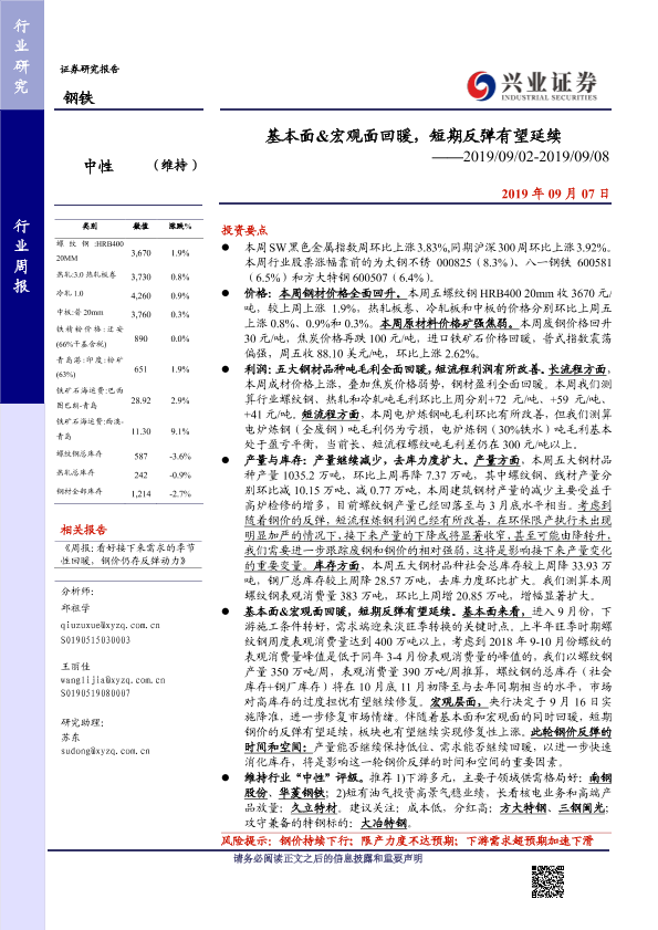 【兴业证券】【20190907】基本面&宏观面回暖,短期反弹有望延续-17页