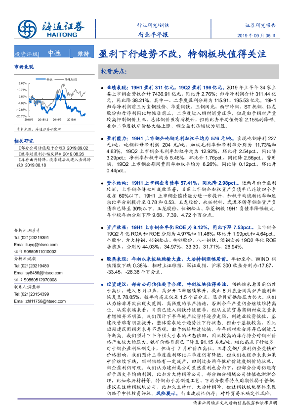 【海通证券】【20190905】20190905-海通证券-钢铁行业半年报:盈利下行趋势不改,特钢板块值得关注-15页